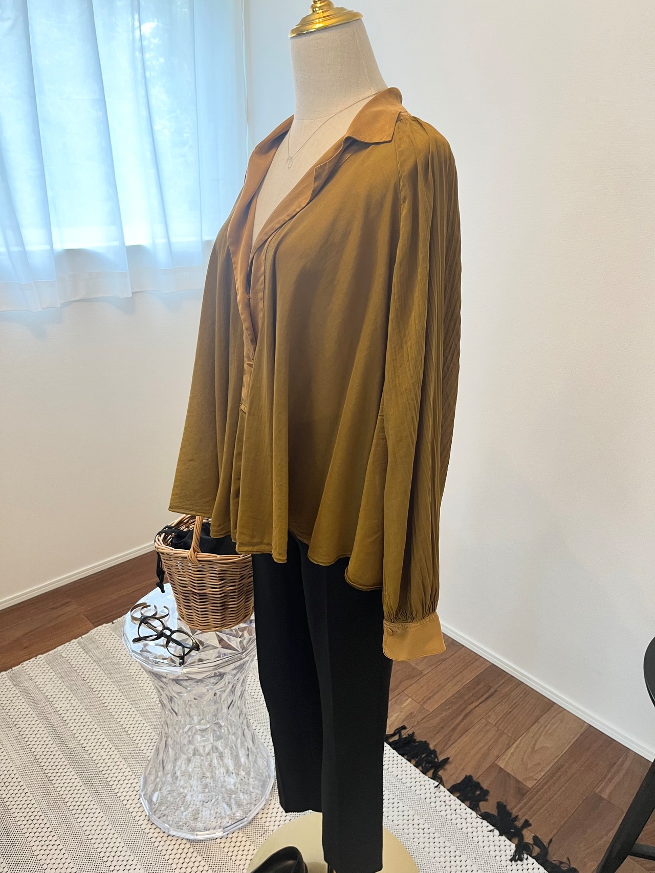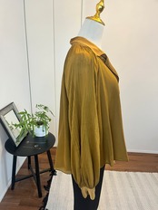 細かなプリーツが入っており、とても華やかなシルエット。ブラウスを主役にして他のアイテムはシンプルに。 ジーンズや白のパンツ、またはタイトなワンピースの上から羽織って。