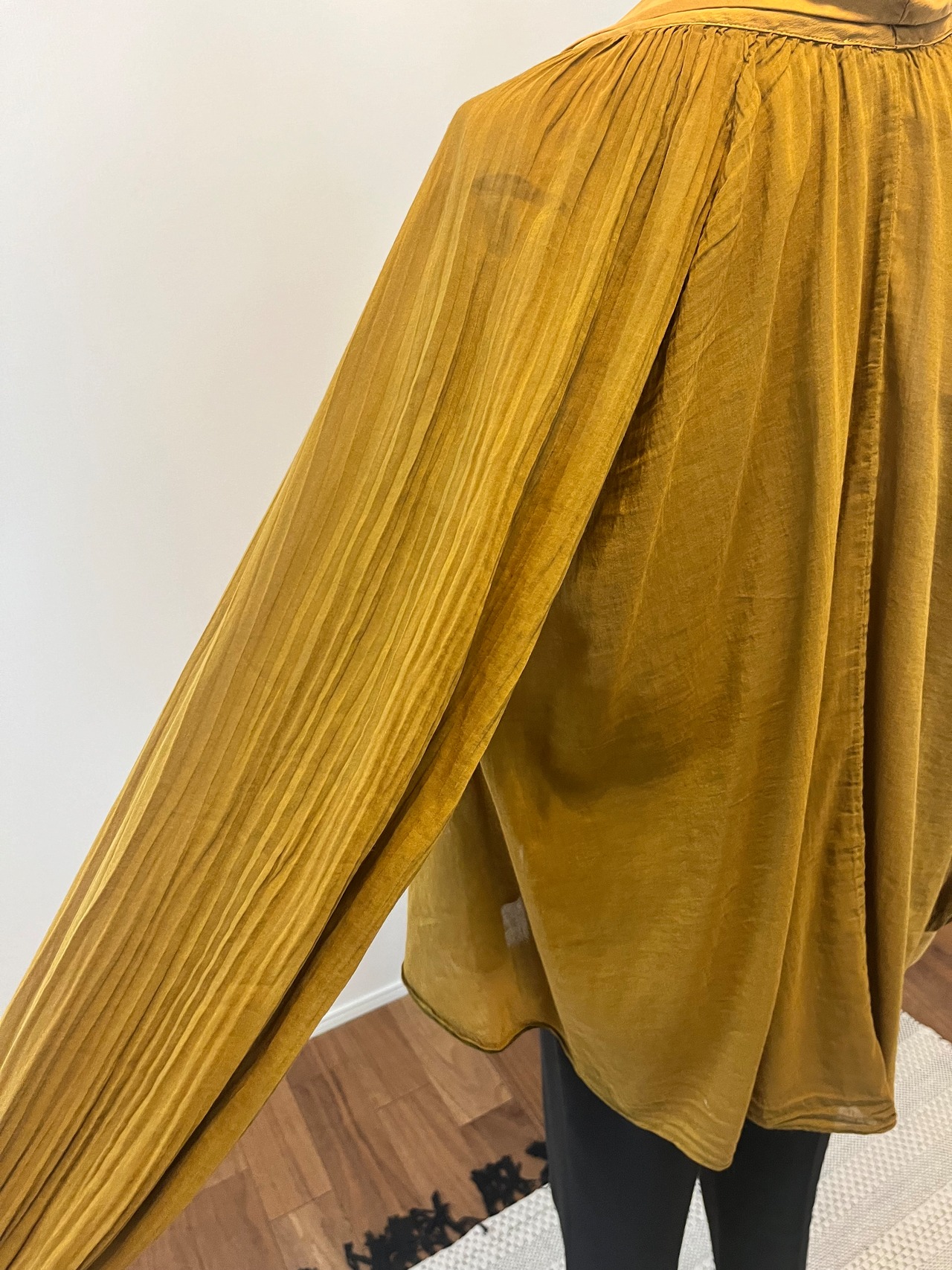 透け感のあるコットンシルクの生地で、春夏はそのまま、秋冬はタートルネックやカットソーなどと重ね着して年中楽しめるアイテムです。