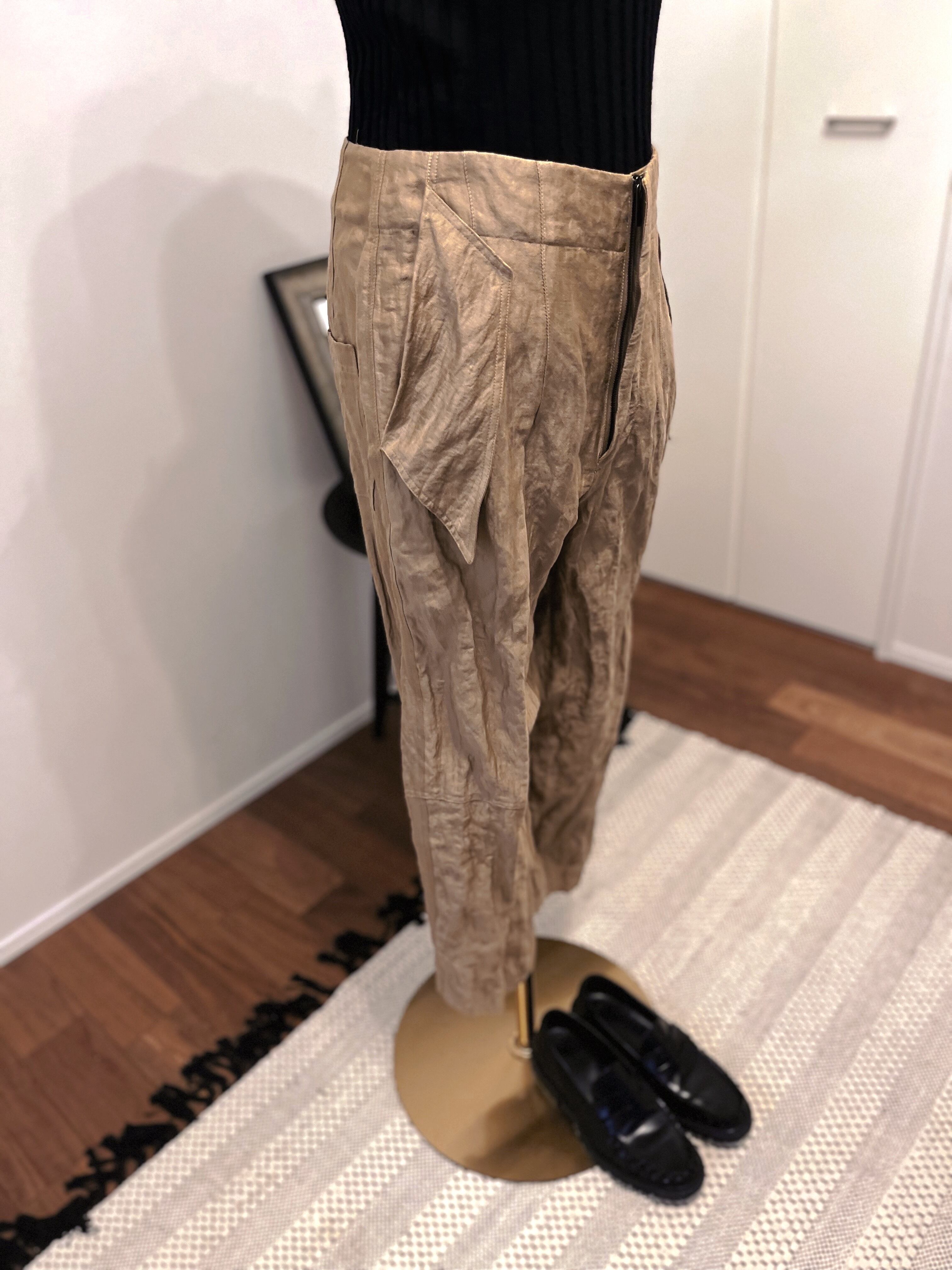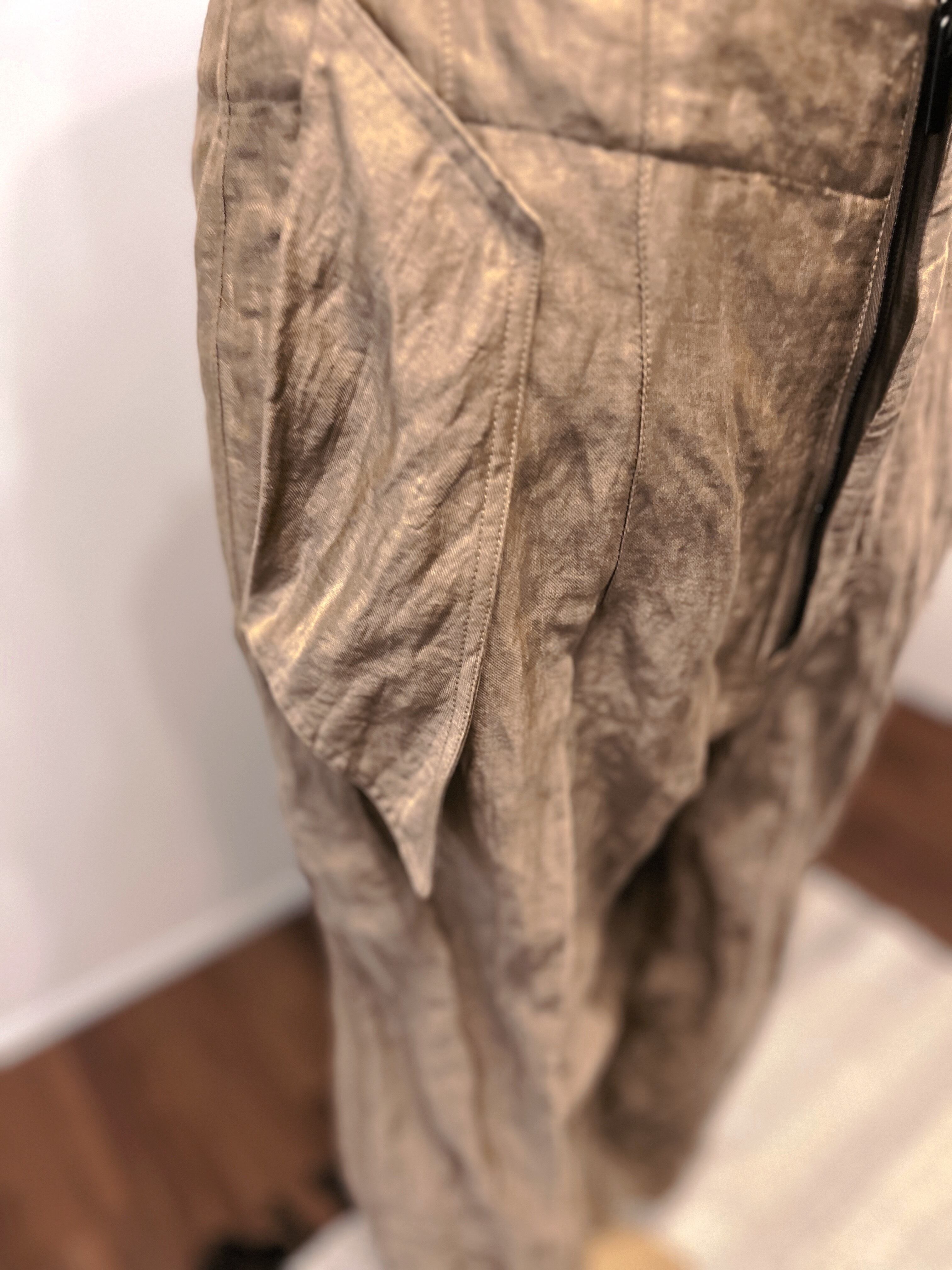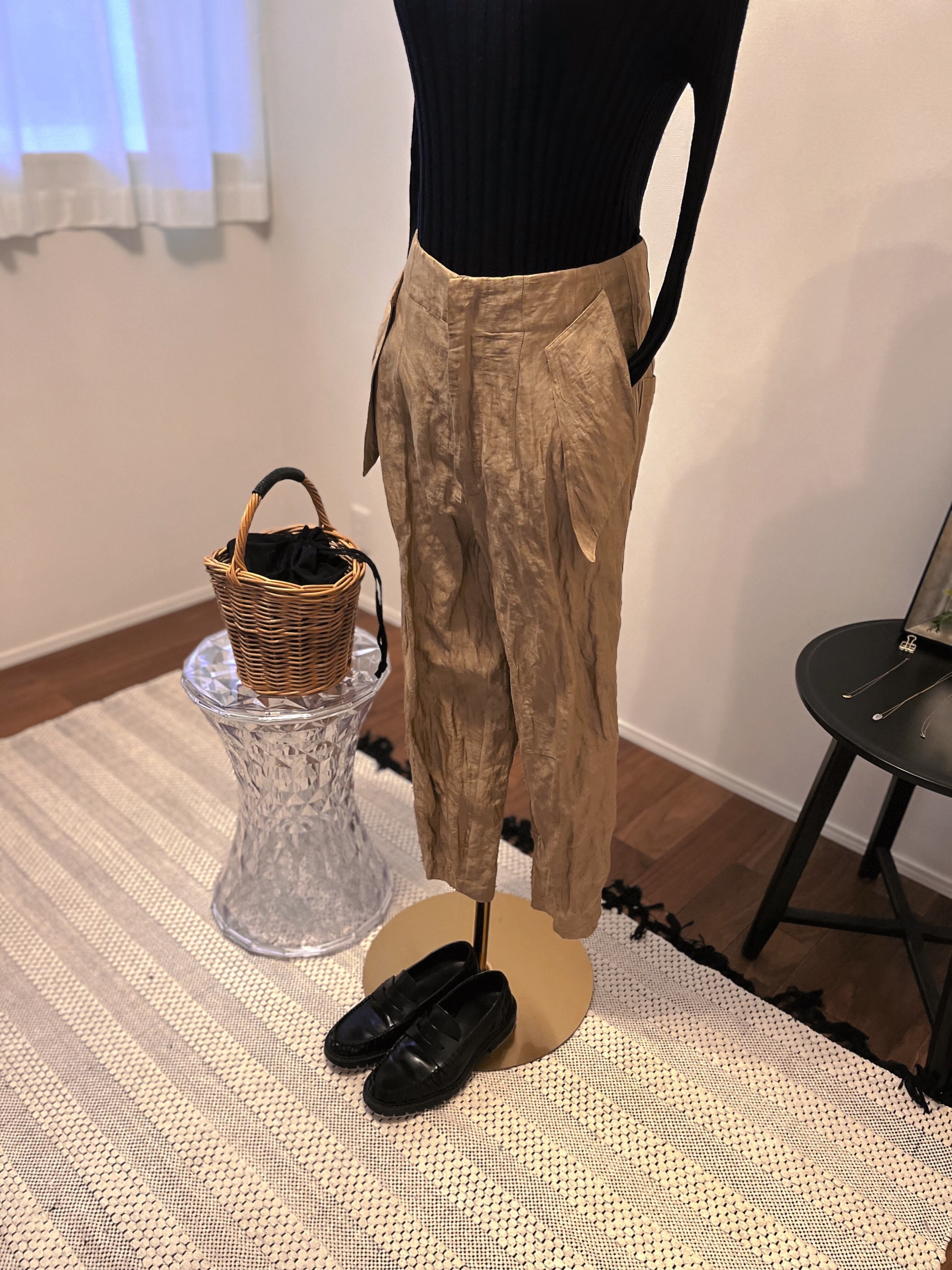 シワ加工が施されている事によりシルクと金属繊維の艶感が強調され、非常に表情のあるオシャレな風合いです。膝で生地が切り返しになっており、動きやすく心地よい着用感。